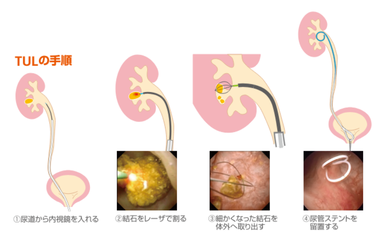 尿管鏡という細い内視鏡を尿道から挿入し、尿管または腎臓にできた結石をレーザーで砕きます。細かくした結石の破片は手術中に体外へ取り出すことができます。