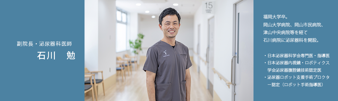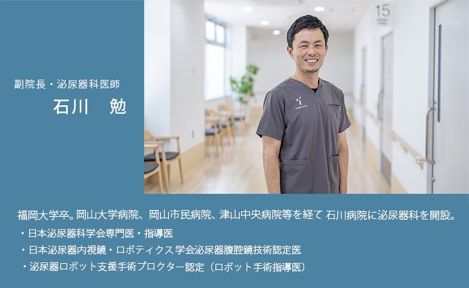 津山で生まれ育ち、医学部卒業後の2011年に岡山大学泌尿器科へ入局し、 その後は中四国の総合病院で研鑽を積み、2019年4月より前任の津山中央病院へ赴任いたしました。津山中央病院ではおよそ5年間勤務し、ロボット支援手術、腹腔鏡手術、レーザー手術、がん薬物治療など、最新の泌尿器科医療を地元で提供できるよう励んでまいりました。ロボット支援腹腔鏡下手術では県北では初めて、県内では5施設目となるロボット支援下腎部分切除術(RAPN)を導入、執刀いたしました。